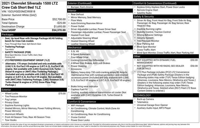 Recent Arrival! Clean CARFAX. Silverado 1500 LTZ, 8-Speed Automatic, 4WD, Jet Black Leather, 10-Way Power Driver Seat w/Lumbar, 10-Way Power Passenger Seat Adjuster w/Lumbar, 12-Volt Rear Auxiliary Power Outlet, 120-Volt Bed Mounted Power Outlet, 120-Volt Instrument Panel Power Outlet, 2 USB Ports, 2 USB Ports (First Row), 4.2 Diagonal Color Display Driver Info Center, 4G LTE Wi-Fi Hot Spot Capable, 6-Speaker Audio System, Advanced Trailering System, Auto-Dimming Inside Rear-View Mirror, Auto-Locking Rear Differential, Auxiliary External Transmission Oil Cooler, Bluetooth® For Phone, Chevrolet Connected Access Capable, Chrome Grille, Chrome Mirror Caps, Color-Keyed Carpeting Floor Covering, Compass, Deep-Tinted Glass, Driver Memory, Electric Rear-Window Defogger, Electrical Lock Control Steering Column, Electronic Cruise Control, Floor Mounted Center Console, Front Frame-Mounted Black Recovery Hooks, Front LED Fog Lamps, Front Rubberized Vinyl Floor Mats, HD Rear Vision Camera, Heated Driver & Front Outboard Passenger Seats, Heated Steering Wheel, Hitch Guidance, Hitch Guidance w/Hitch View, Integrated Trailer Brake Controller, Keyless Open & Start, Lane Change Alert w/Side Blind Zone Alert, Leather Wrapped Steering Wheel, LED Cargo Area Lighting, LTZ Convenience Package, LTZ Plus Package, Manual Tilt/Telescoping Steering Column, OnStar & Chevrolet Connected Services Capable, Outside Heated Power-Adjustable Mirrors, Perimeter Lighting, Power Door Locks, Power Front Passenger Windows w/Express Up/Down, Power Front Windows w/Driver Express Up/Down, Power Rear Windows w/Express Down, Power Sliding Rear Window w/Rear Defogger, Power Tailgate, Preferred Equipment Group 1LZ, Rear Cross Traffic Alert, Rear Dual USB Charging-Only Ports, Rear Rubberized-Vinyl Floor Mats, Rear Wheelhouse Liners, Remote Vehicle Starter System, Safety Package, SiriusXM w/360L, Standard Tailgate, Steering Wheel Audio Controls, Theft Deterrent System (Unauthorized Entry), Trailering Package, Ultrasonic Front & Rear Park Assist, Universal Home Remote, Up-Level Rear Seat w/Storage Package, Ventilated Driver & Front Passenger Seats, Wireless Phone Projection. 2021 Chevrolet Silverado 1500 LTZ 4WD 8-Speed Automatic The Ganley Guarantee Certified signifies that this used vehicle has been subjected to a demanding 125-point quality assurance inspection and has passed the Ganley Guarantee Certified standards for mechanical performance, interior and exterior appearance. The vehicle is backed by a 3 month, 3,000 mile Limited Warranty, 24-hour Roadside Assistance and Rental and Travel Breakdown benefits! With a Ganley Guarantee Certified Pre-Owned vehicle, you'll experience all the excitement and confidence of buying a new vehicle, yet enjoy the value of a great Pre-Owned vehicle! EcoTec3 5.3L V8