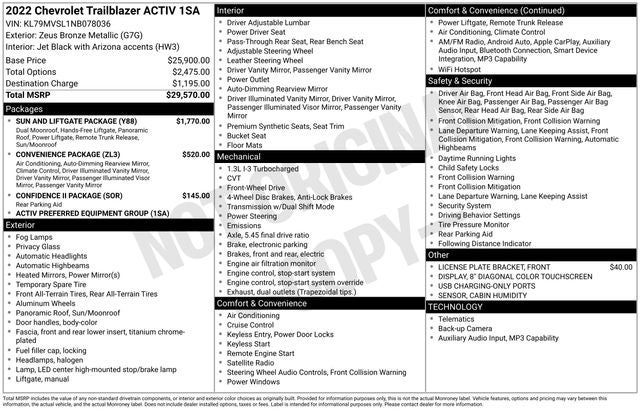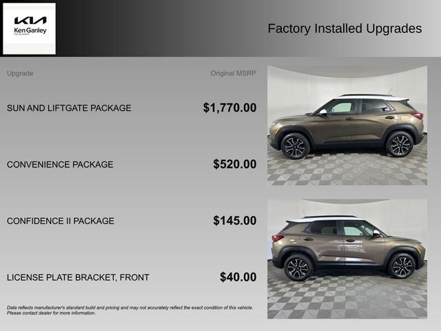 Recent Arrival! TrailBlazer ACTIV, 1 Type-A & 1 Type-C USB Charging-Only Ports, 120-Volt Power Outlet, 8 Diagonal Color Touchscreen Display, Cabin Humidity Sensor, Confidence II Package, Convenience Package, Driver & Front Passenger Illuminated Vanity Mirrors, Dual-Pane Panoramic Power Sunroof, Hands-Free Power Programmable Liftgate, Heated Steering Wheel, Inside Rear-View Auto-Dimming Mirror, Preferred Equipment Group 1SA, Rear Park Assist, Single-Zone Auto Climate Control Air Conditioning, Sun & Liftgate Package. 2022 Chevrolet TrailBlazer ACTIV FWD CVT The Ganley Guarantee Certified signifies that this used vehicle has been subjected to a demanding 125-point quality assurance inspection and has passed the Ganley Guarantee Certified standards for mechanical performance, interior and exterior appearance. The vehicle is backed by a 3 month, 3,000 mile Limited Warranty, 24-hour Roadside Assistance and Rental and Travel Breakdown benefits! With a Ganley Guarantee Certified Pre-Owned vehicle, you'll experience all the excitement and confidence of buying a new vehicle, yet enjoy the value of a great Pre-Owned vehicle! 1.3L Ecotec Turbo DOHC SIDI w/VVT