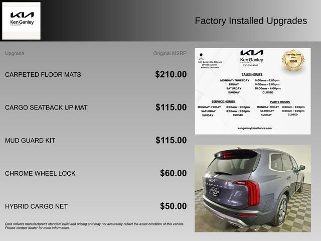 Contact Ken Ganley Kia Alliance for your Kia automotive needs! Search our Used Kia inventory and contact our internet sales department for current specials or to schedule a test drive. Located in Alliance, OH, our internet sales team provides excellent savings to customers in Alliance, Akron, Canton, and Streetsboro areas. Contact our dealership online for an internet quote.Contact Ken Ganley Kia Alliance about this Used 2022 Kia Telluride EX - #P1594, VIN# 5XYP3DHC7NG261350