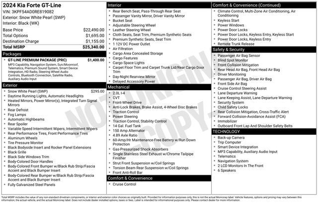 Recent Arrival! CARFAX One-Owner. Clean CARFAX. Forte GT-Line, GT-Line Premium Package, harman/kardon® Premium Audio, LED Interior Lighting, Power Sunroof, Wireless Charging. 2024 Kia Forte GT-Line FWD CVT Kia Certified Pre-Owned- You get reliability and peace of mind knowing that every Kia Certified Pre-Owned (CPO) has undergone a thorough 165-Point Quality Assurance Inspection. From brakes to electrical to engine, we inspect every vehicle to make sure they meet our highest standard. All Kia Certified Pre-Owned vehicles come with: •10 Year / 100,000 Mile Limited Powertrain Warranty • Includes 1 Year / 12,000 Mile Platinum Coverage • Travel Breakdown Coverage up to $100 per calendar day, up to $500 per covered mechanical breakdown.• Emergency Towing Coverage Up to $75 per covered mechanical breakdown• Rental Car Coverage up to $35 per day, max 10 days, per covered mechanical breakdown • Cross Country Motor Club Driver’s OneCard Membership, that includes:- Flat Tire: Change your flat tire with your inflated spare - Out of Gas: Arrange to have up to three gallons of free gas delivered if your vehicle runs out of fuel - Lockout: Assist in getting vehicle unlocked if the keys are lost, broken or locked inside your vehicle - Jump-Start: Arrange a battery jump. 2.0L I4 MPI