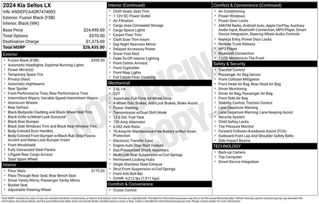 Recent Arrival! CARFAX One-Owner. Clean CARFAX. 2024 Kia Seltos LX AWD CVT Kia Certified Pre-Owned- You get reliability and peace of mind knowing that every Kia Certified Pre-Owned (CPO) has undergone a thorough 165-Point Quality Assurance Inspection. From brakes to electrical to engine, we inspect every vehicle to make sure they meet our highest standard. All Kia Certified Pre-Owned vehicles come with: •10 Year / 100,000 Mile Limited Powertrain Warranty • Includes 1 Year / 12,000 Mile Platinum Coverage • Travel Breakdown Coverage up to $100 per calendar day, up to $500 per covered mechanical breakdown.• Emergency Towing Coverage Up to $75 per covered mechanical breakdown• Rental Car Coverage up to $35 per day, max 10 days, per covered mechanical breakdown • Cross Country Motor Club Driver’s OneCard Membership, that includes:- Flat Tire: Change your flat tire with your inflated spare - Out of Gas: Arrange to have up to three gallons of free gas delivered if your vehicle runs out of fuel - Lockout: Assist in getting vehicle unlocked if the keys are lost, broken or locked inside your vehicle - Jump-Start: Arrange a battery jump. 2.0L I4 MPI