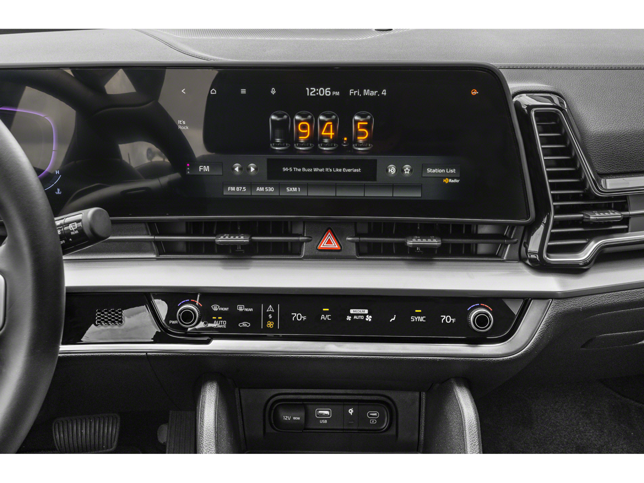 - Radio: AM/FM/HD Audio System -inc: 12.3" touchscreen, navigation, satellite radio, 6 speakers, Apple Carplay and Android Auto, Kia Connect, WiFi, map OTA, voice recognition, USB, steering wheel audio controls and Bluetooth® Hands-free phone and streaming audio